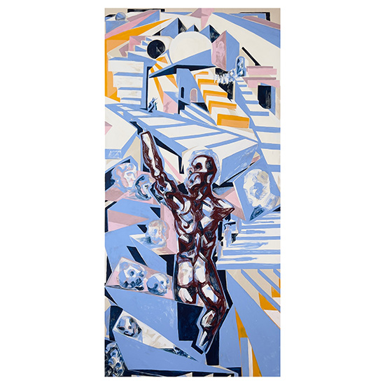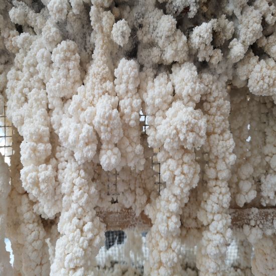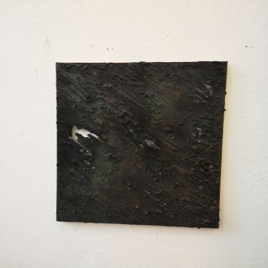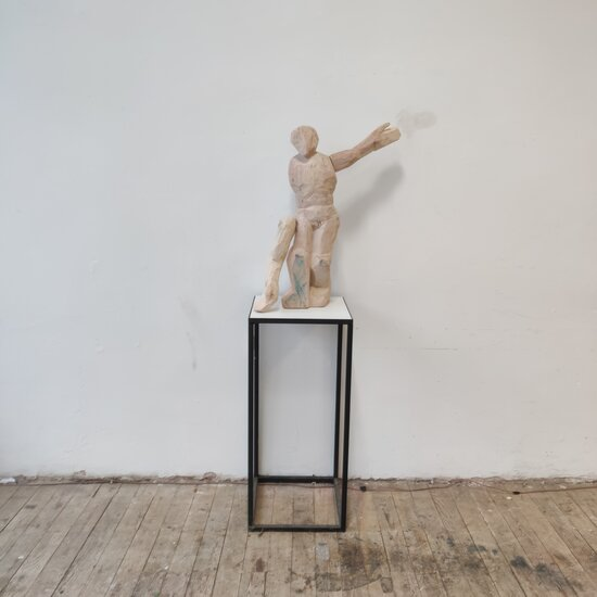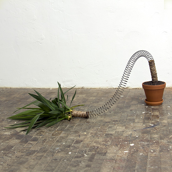 Eine Palme, eine Stahlfeder, ein Blumentopf mit Erde, 50x170x120cm